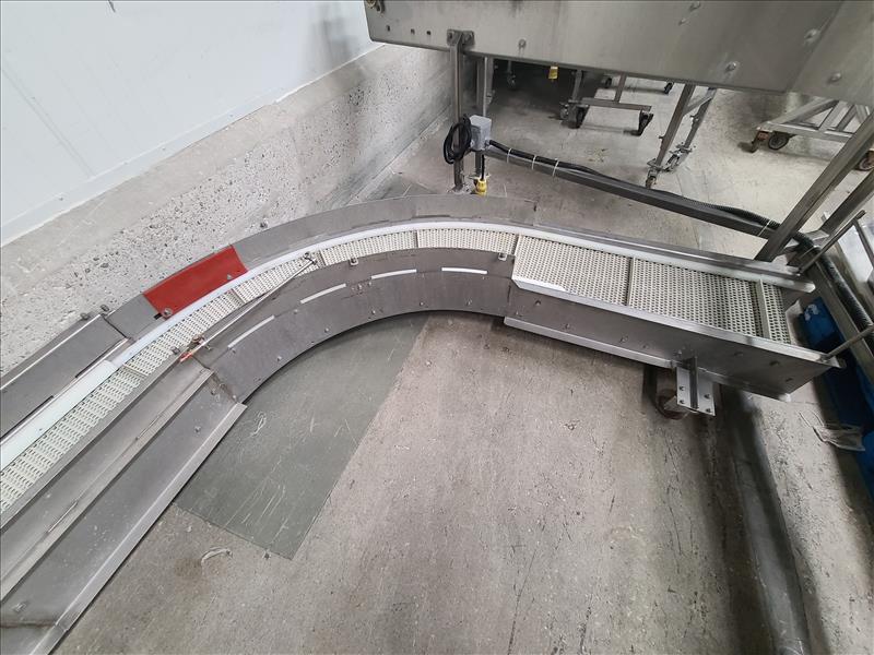 45 deg. inclined power conveyor, s/s, plastic fluted belt approx. 12 in. x 15 ft. x 46 in. high, wash-down motor, VSD, casters