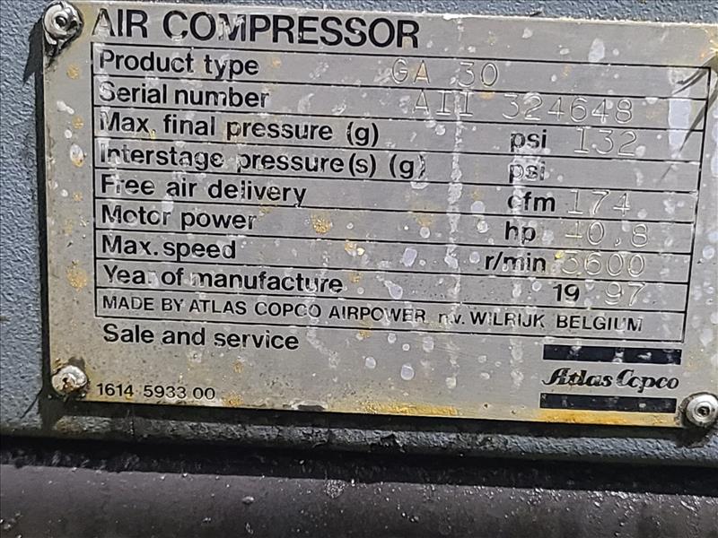 Atlas Copco Air Compressor, model GA 30, S/N. AII 324648, 40 hp, 132 PSI