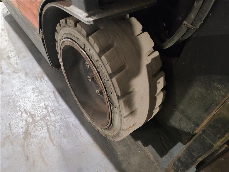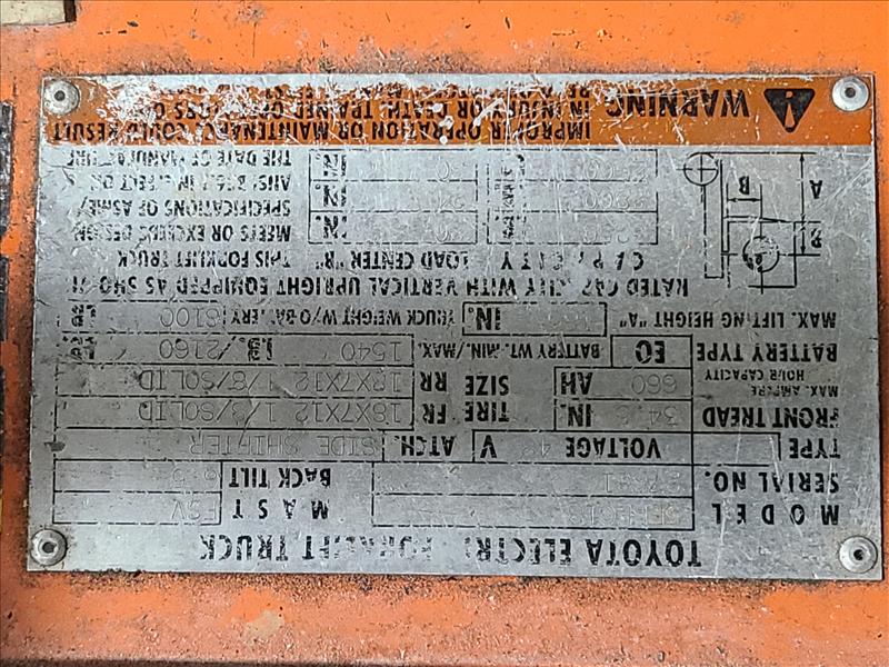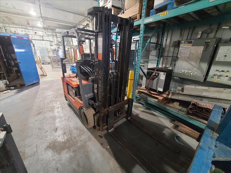 Toyota Electric Forklift Truck, model 5FBFC18, S/N.7681, 3250 lbs./185 in. lift cap., 3-wheel, side-shift, 48V, 55,113 hours, c/w charger (delayed removal applies)