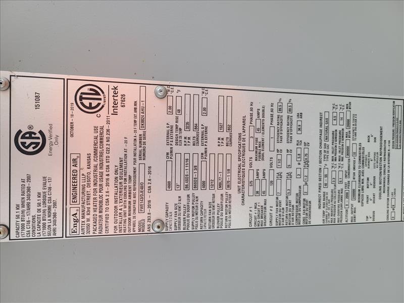 Engineered Air DJE Series Indirect Natural Gas Fired Heater, model FWE143/DJE40/0, S/N DK8824 AHU-1, 4600 CFM, 575V, 45 Amps, 3 Phase, 60 Hz