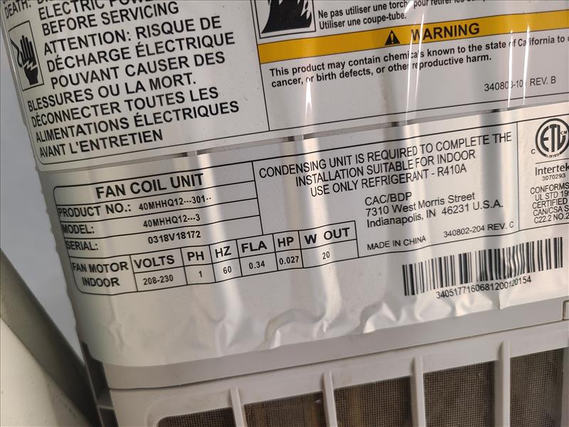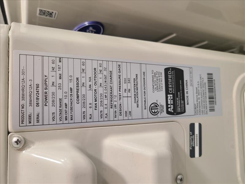 Carrier Cooling/Heating Wall Mounted Air Conditioning System, model 40MHHQ12--3, S/N 0318V18172, w/ Carrier Ductless Heat Pump, model 38MHRQ12A--3, S/N 0618V24760 (Missing Remote)