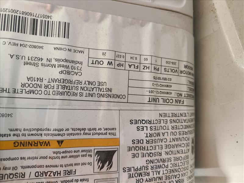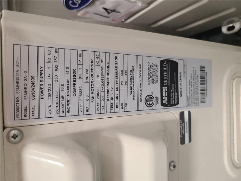 Carrier Cooling/Heating Wall Mounted Air Conditioning System, model 40MHHQ12--3, S/N 0318V18175, w/ Carrier Ductless Heat Pump, model 38MHRQ12A--3, S/N 0618V24639 (Missing Remote)