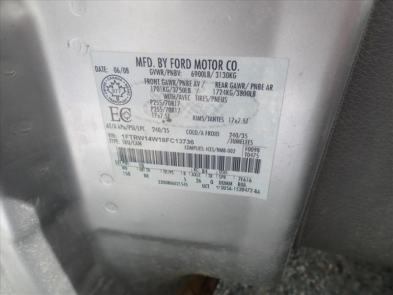 2008 Ford F150 exalt pick-up truck, VIN 1FTRW14W18FC13736, approx. 245385 km, crew-cab, 6 ft box, 4x4, Triton eng. (Tag 7807 Loc Bones Yard)