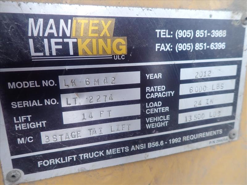 LiftKing rough terrain fork lift truck, mod. LK8M42, ser. no. LT2274 (2012), diesel, 6000 lbs cap., 3-stage mast, 14 ft lift height, (Tag 9136 Loc Rolling Stock)
