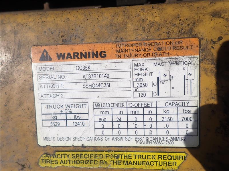 CAT forklift truck, mod. GC35U, ser. no. AT87B10149, 7000 lbs cap., 2-stage mast, side shift (req. repair) (Tag 9097 Loc Rolling Stock)