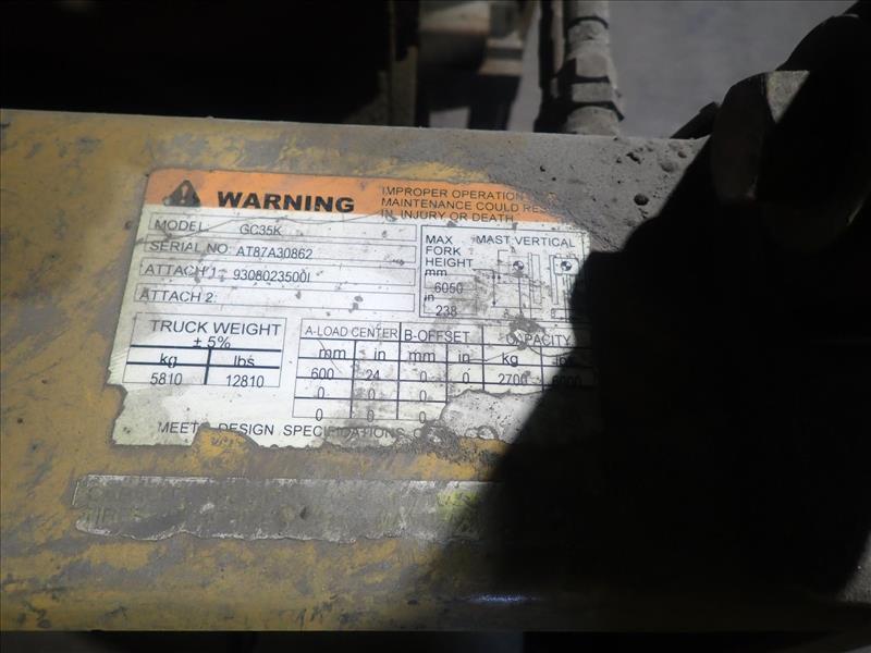 CAT forklift truck, mod. GC35K, ser. no. AT87A30862, 6000 lbs cap., propane, 3-stage mast, side-shift, hour meter reads 16701 (Tag 8579 Loc Cell House)