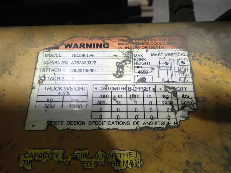 CAT forklift truck, mod. GC35K-LP, ser. no. AT87A30322, 6600 lbs cap., propane, 3-stage mast, side-shift, hour meter reads 13928 (Tag 8568 Loc Cell House)