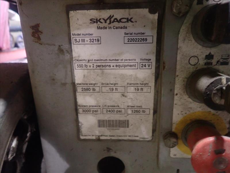 SkyJack scissor lift, mod. SJIII-3219, ser. no. 22022269, 24V, 2-person, 500 lbs cap., 19 ft lift height, hour meter reads 45 (Tag 9145 Loc Mill)