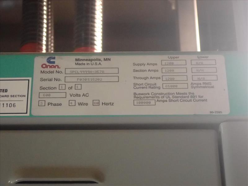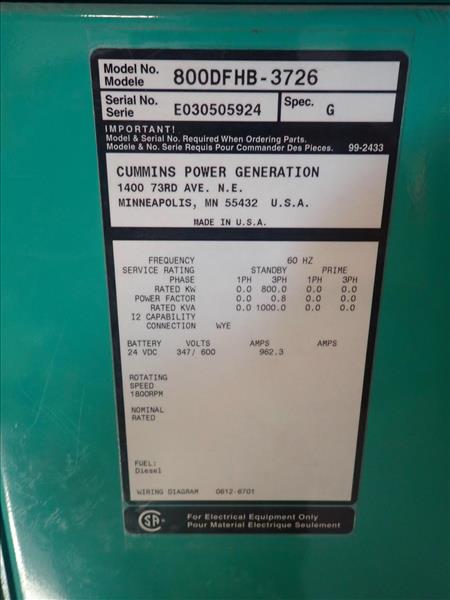 Cummins back-up generator, mod. 800DFHB-3726, ser. no. E030505924, diesel, 1000 KVA, 1030 hp c/w circuit breaker, skid-mounted (Tag 7741 Loc 777/Hoist House)