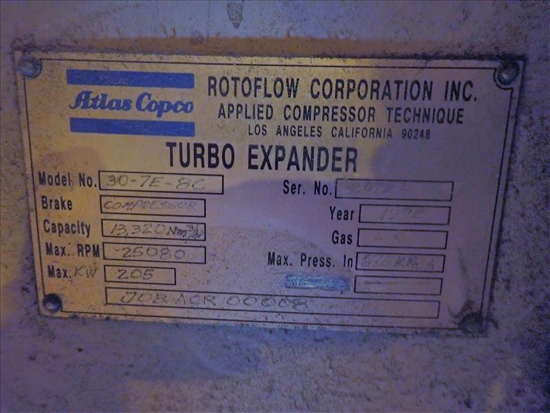 Atlas Copco RotoFlow turbo expander/booster, mod. 30-ZE-8C, ser. no. 20724, 13320NM cu./hr cap. w/ heat exchangers, control panels, flow meters and related pipes and valves (Tag 7007 Loc Oxygen Plant)
