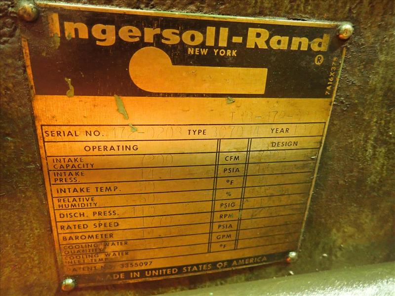 Ingersoll Rand centrifugal air compressor, mod. Centac, type 307014, ser. no. 172-0203, 7000 CFM, 55010 running hrs. w/ IR EM DiamondLine continuous duty induction motor, type 1C, ser. no. 272221311, 1500 hp (Tag 7033 Loc Power House)
