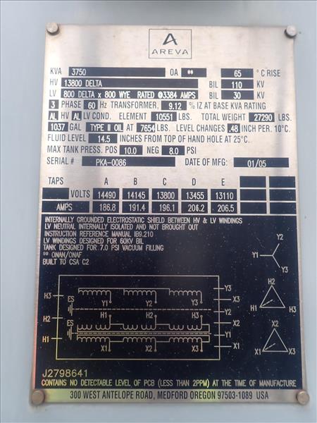 Areva transformer, 3750/4688 KVA, 13800DELTA HV, 800DELTAx800WYE@3384A LV (Tag 9114 Loc 777)