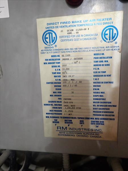RM Ind. air make-up unit, mod. DG1500, ser. no. 1037, 10000 CFM (Tag 7696 Loc Cell House)