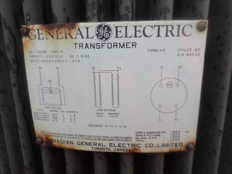 GE transformer, type H, 250 KVA, 6900/11950Y-575 V, 434.8 A (Tag 7117 Loc Crusher Sub Stn)
