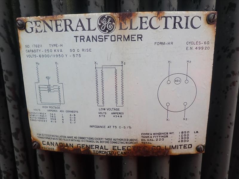 GE transformer, type H, 250 KVA, 6900/11950Y-575 V, 434.8 A (Tag 7118 Loc Crusher Sub Stn)