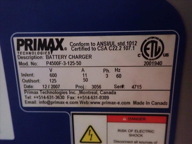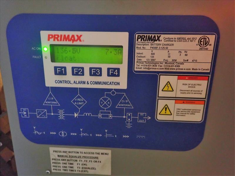 Primax battery charger, mod. P4500F-3-125-50 w/ Absolyte battery bank (Tag 7099 Loc North End Sub Stn)