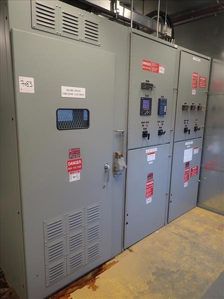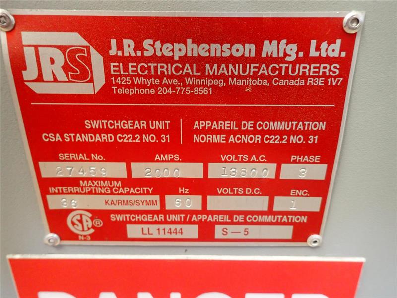 E-House, skid-mounted, approx. 12 ft. x 20 ft. c/w (2) breaker panels and (1) JRS switchgear panel, ser. no. 27459, 13800 V, 2000 A, 60 Hz, 3 Ph (Tag 7083 Loc North End Sub Stn)