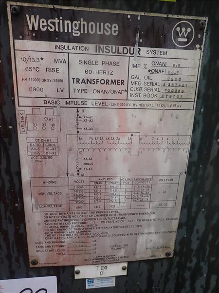 Westinghouse transformer, 110000 GRDY/63500 HV, 6900 LV, 1 Ph, 60 Hz (Tag 7092 Loc North End Sub Stn)
