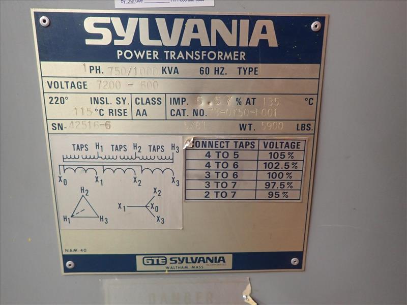 Sylvania transformer, 750/1000 KVA (Tag 7596A Loc Casting)