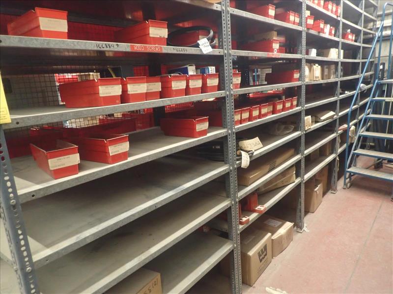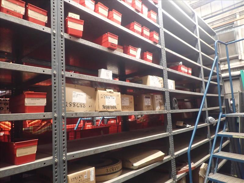 contents of shelving: plates, seals, switches, bearings, belting, couplings, spare parts, etc. (Bin 535) (Tag 8033 Loc WH Yard)