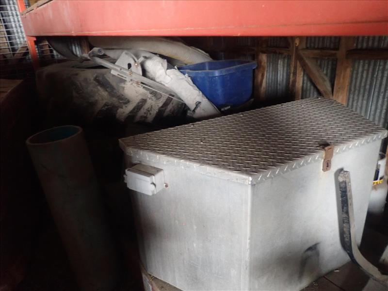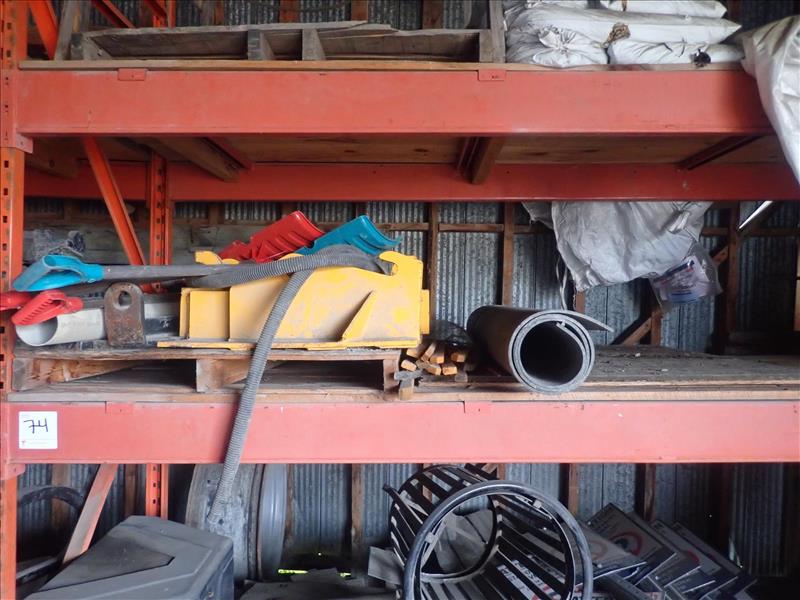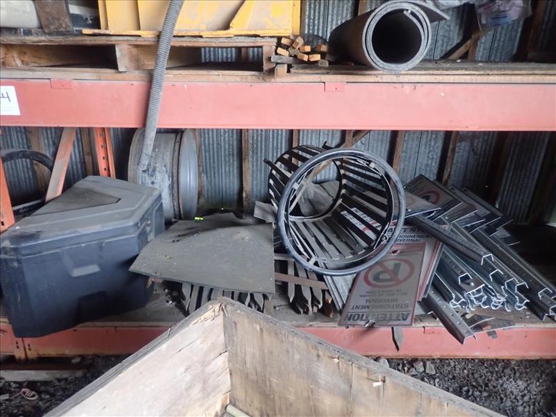 contents of racking: misc. spare parts, snow plow blades, tool boxes, signage, etc.