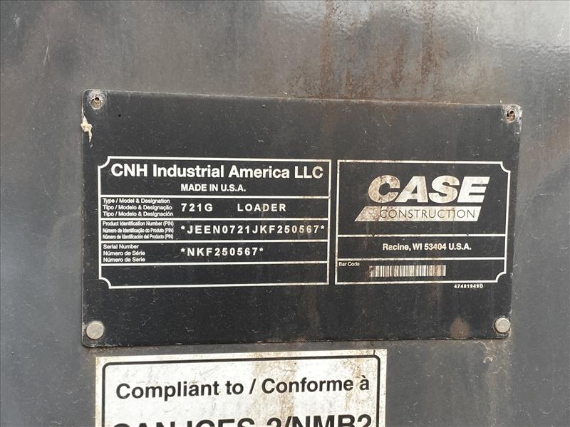 Case 721G Wheel Loader, enclosed cab, auxiliairy hydraulic systems, GRYB Q/C, rearview camera, D/S bucket (unit 172), X SNOPLUS 20.5R25 winter tires, VIN JEEN0721JKF250567, approx 615 hrs, 2020