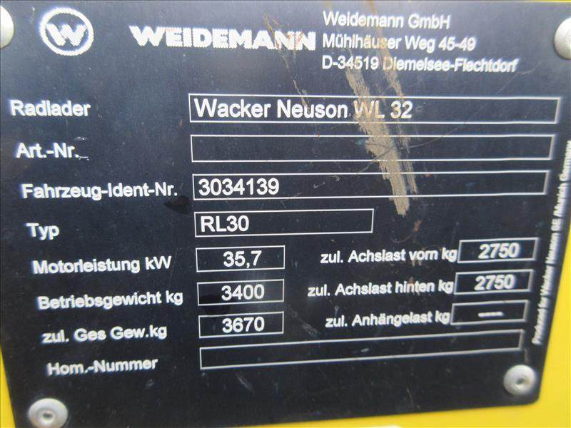 Wacker Neuson WL32 Wheel Loader, enclosed cab, auxiliairy hydraulic systems, hydraulic Q/C, forks, SN 3034139, approx 2511 hrs, 2017