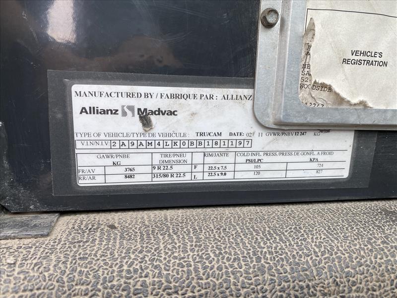 Johnston RD/S Street Sweeper, automatic transmission, 3765-8482kg axles, 9R22.5 front tires, 315/80R22.4 rear tires, VIN 2A9AM4LK0BB181197, approx 23691 mi, 2011