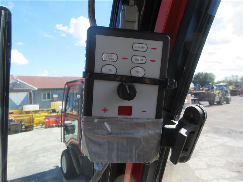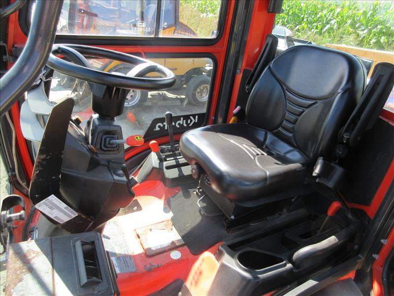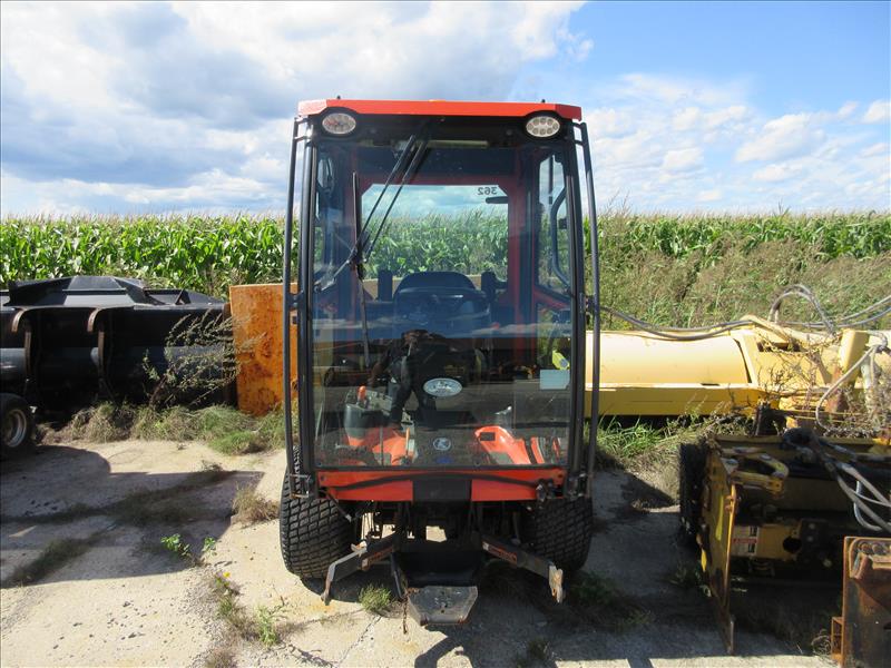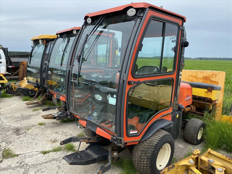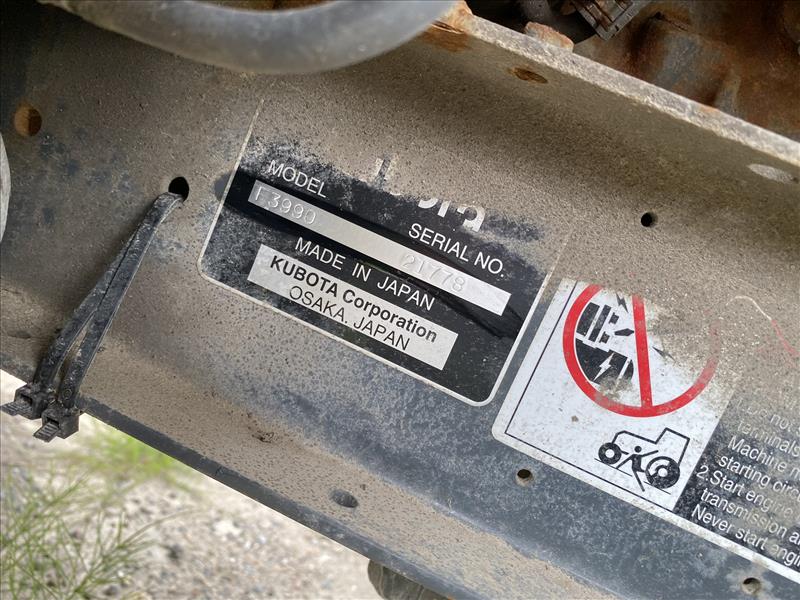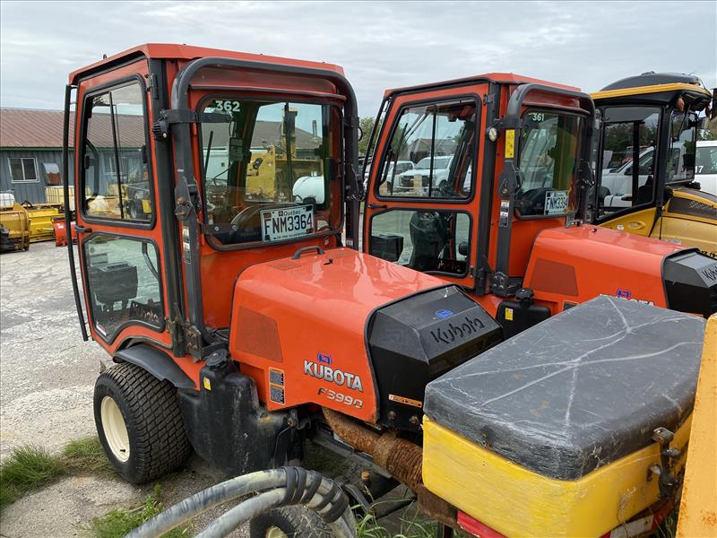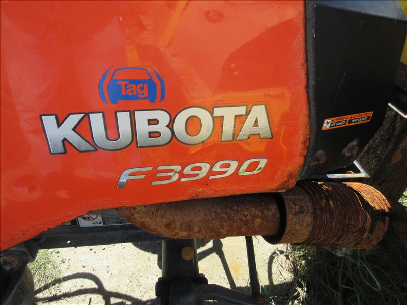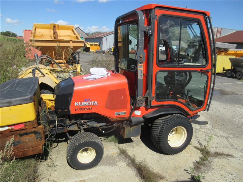 Kubota F3990 Ride-On Lawn Mower, enclosed cab, SN 21778, c/w SNOWEX salt spreader, approx 835 hrs, 2019