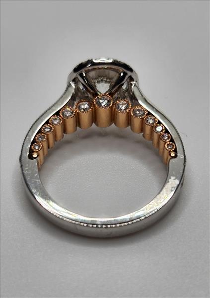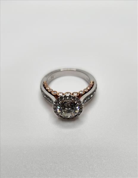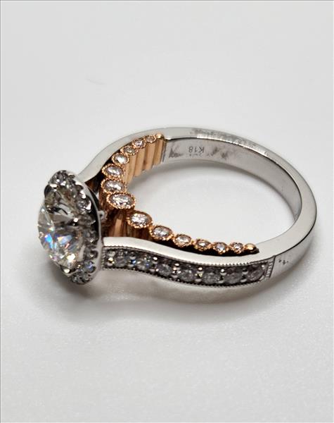 One lady’s stamped 18kt white and pink gold (D1032) diamond engagement ring. Contained at the centre is one 4-claw set round brilliant cut diamond that measures approximately 7.42-7.37x4.60mm and weighing approx. 1.55ct of SI1 clarity (ION inscribed on table #372760) H colour and Excellent cut. This diamond is set within a 10.70mm round by 1.50mm thick diamond halo. Whale tail set within this 1.50mm wide halo are 20x0.015ct round brilliant cut diamonds. Attached to each side of this halo is a 3.0mm wide by 1.50mm thick slightly curved milgrained shank that is shared claw set with 7x0.025ct round brilliant cut diamonds. This white gold shank tapers to 2.90mm wide at the base. The halo is supported by four curved spokes that sit on an arch of 13 pink gold tubes each individually milgrained bezel set on either end with one round brilliant cut diamond. Set are 2x0.05ct, 4x0.035ct, 4x0.02ct, 4x0.01ct, 8x0.0075ct and 4x0.005ct round brilliant cut diamonds. All diamonds are average SI1-VS2 clarity, F-G colour and Very Good to Excellent cut. (Gem Scan Certificate # 1252884) Total Estimated Weight: 6.84 grams Total Estimated Diamond Weight: 2.64ct Instruments Used: microscope, gauges, metric scale, gold tester