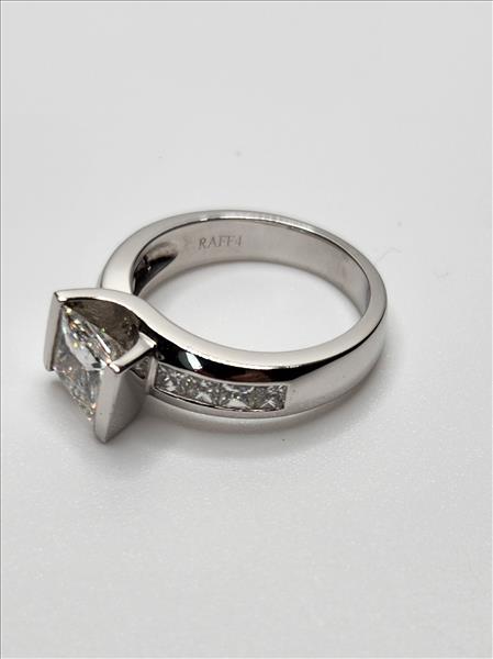 One lady’s stamped RAFP4 and tested 14kt white gold diamond ring by Michael Hill. Contained at the centre is one diagonally channel set princess cut diamond that measures approximately 6.39x6.10x4.06mm and weighing approximately 1.31ct (by scale) of VS1 clarity, F colour and Very Good cut (GIA Report number 6117091108). The shank of this ring is offset and tapers from 5.30mm wide by 2.70mm thick to 3.50mm wide and 1.40mm thick at the base. Channel set within each side of the shank are 4x0.075ct princess cut diamonds all of average SI1 clarity, E-F colour and Good to Very Good cut. Total Estimated Weight: 6.62 grams Total Estimated Diamond Weight: 1.91ct Instruments Used: microscope, gauges, metric scale, gold tester