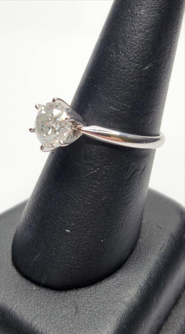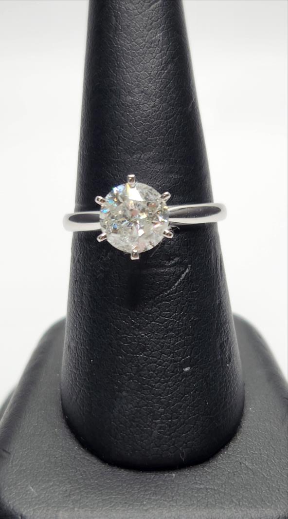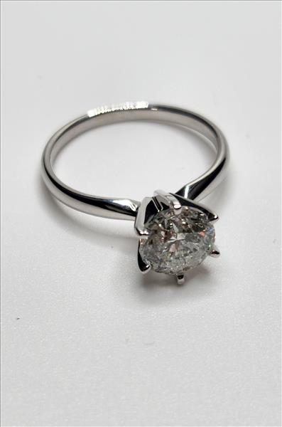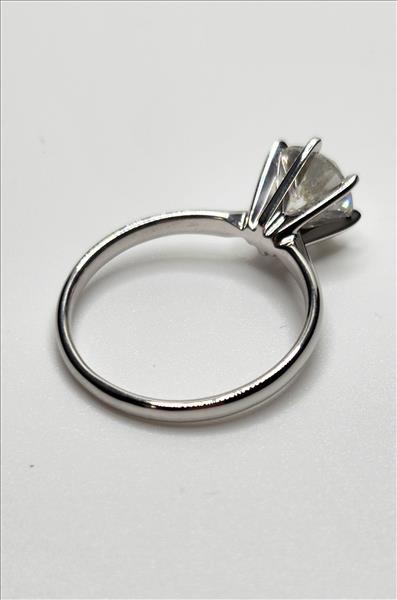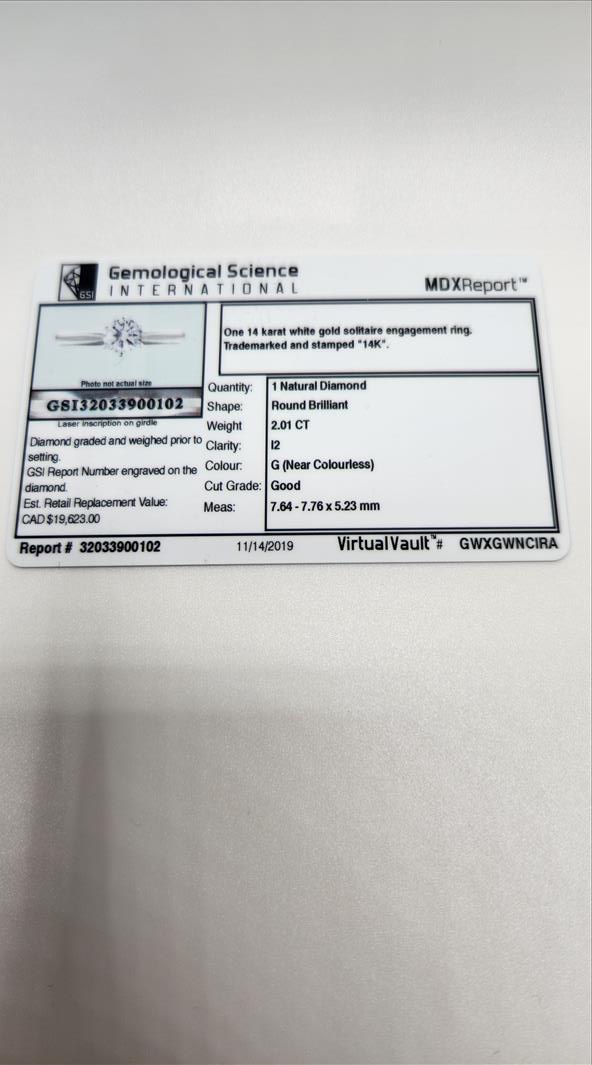 One lady’s stamped and tested 14kt white gold diamond solitaire engagement ring trademarked by Charm diamond centres (Report #32033900102). Six claw set at the centre is one 9.30mm high round brilliant cut diamond measuring approximately 7.64-7.76x5.23mm and weighing 2.01ct (by scale) of I2 clarity, G colour and Good cut. Laser inscribed GS132033900102. This diamond sits between a pointed shank that measures 2.60mm high and widens to 2.30mm wide at the sides before tapering to 1.90mm wide at the base. Total Estimated Weight: 3.15 grams Total Estimated Diamond Weight: 2.01ct Instruments Used: microscope, gauges, metric scale, gold tester