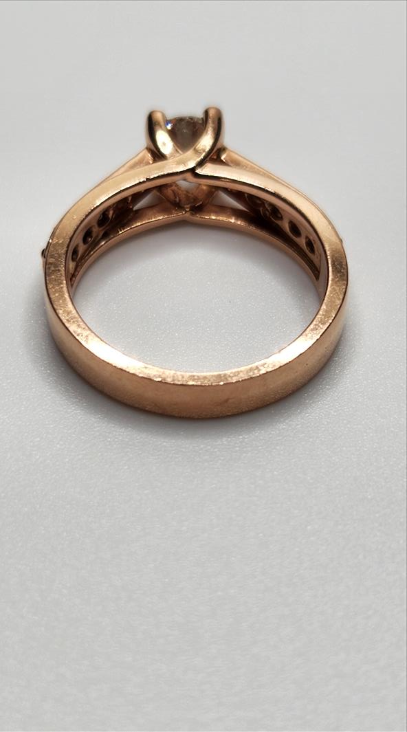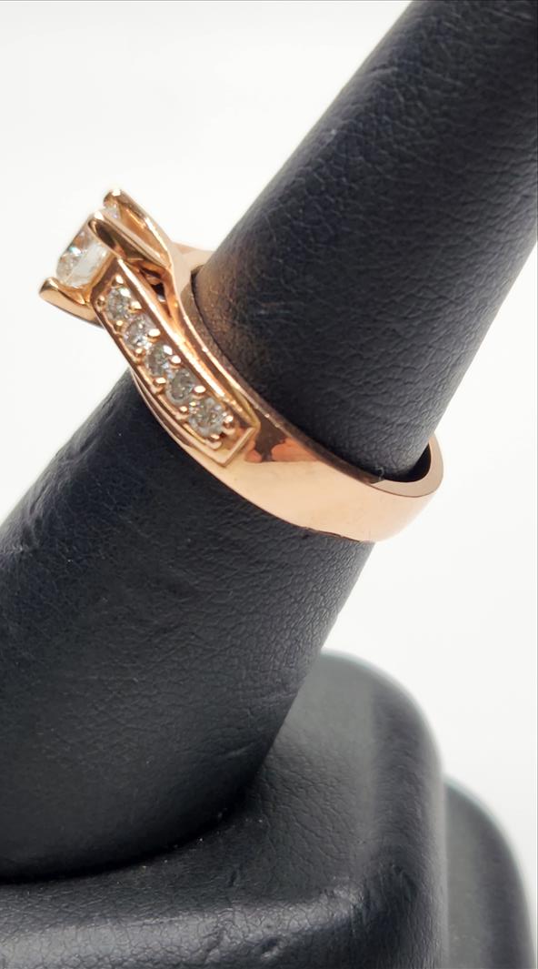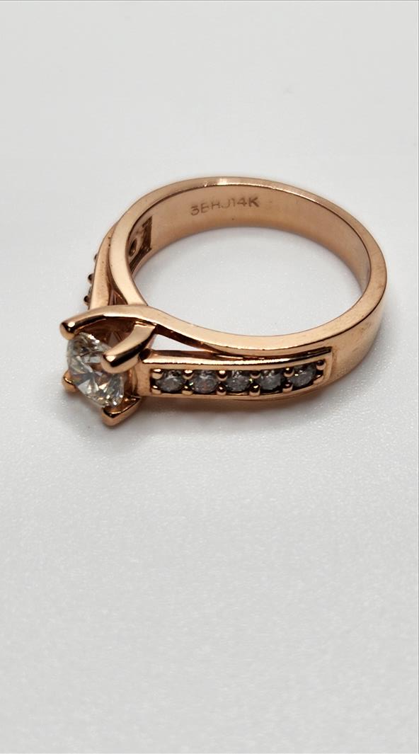 One lady’s stamped and tested 14kt pink gold diamond engagement ring. Contained at the centre is one “Lucida” style four claw set round brilliant cut diamond measuring approximately 5.50-5.50x3.42mm and weighing approximately 0.63ct of I1 clarity, I-J colour and Good cut. The shank of this ring tapers from 4.90m wide to 3.55mm wide at the base. Shared claw set within a 3.30mm wide centre raised shank are 5x0.03ct round brilliant cut diamonds all of average I1 clarity, I-J colour and Good cut.\nTotal Estimated Weight: 4.90 grams \nTotal Estimated Diamond Weight: 0.93ct\nInstruments Used: microscope, gauges, metric scale, gold tester