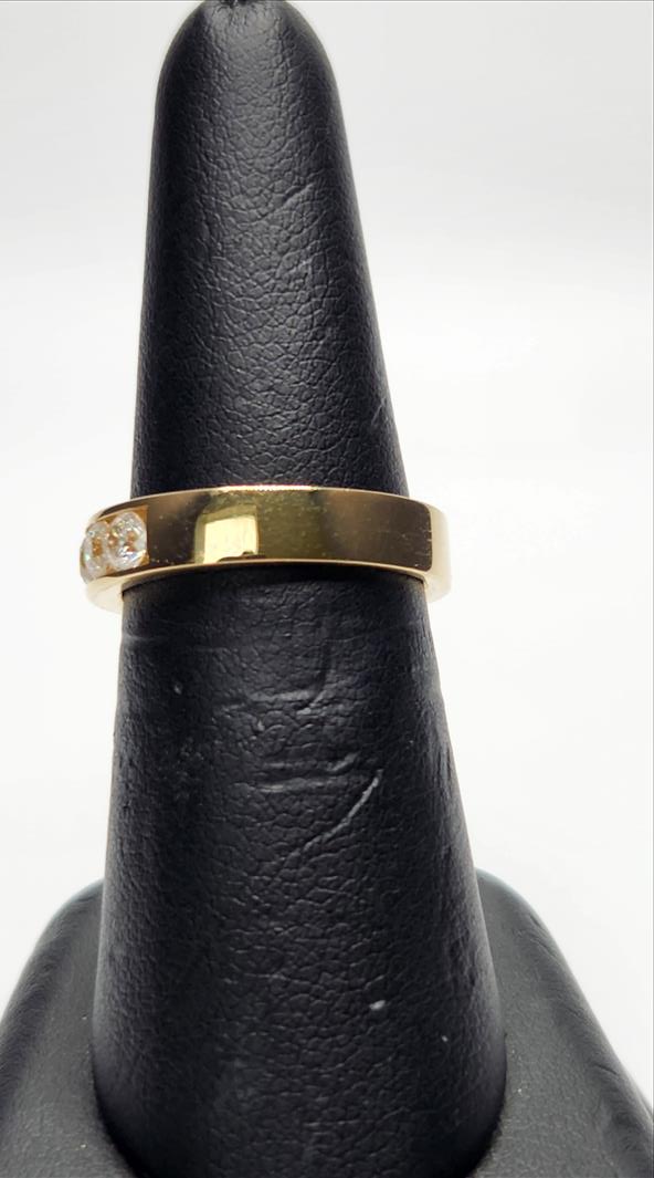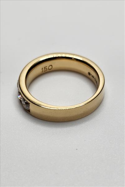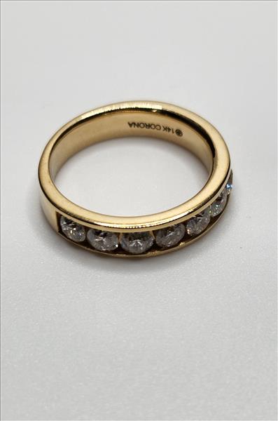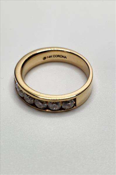 One lady’s stamped and trademarked Corona 14kt yellow gold diamond anniversary band. This band tapers from 4.80mm wide and 2.00mm high, at the top, to 4.20mm wide and 1.25mm thick at the base. Channel set across the top of this ring are 10x0.15ct round brilliant cut diamonds. All diamonds are of average I1 clarity, G-H colour and Very Good cut.\nTotal Estimated Weight: 4.86 grams \nTotal Estimated Diamond Weight: 1.50ct\nInstruments Used: microscope, gauges, metric scale, gold tester