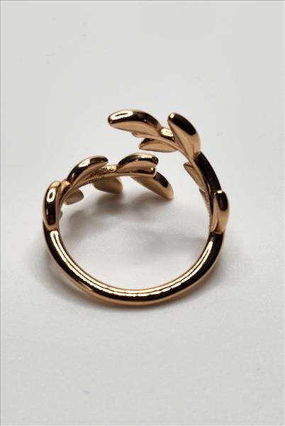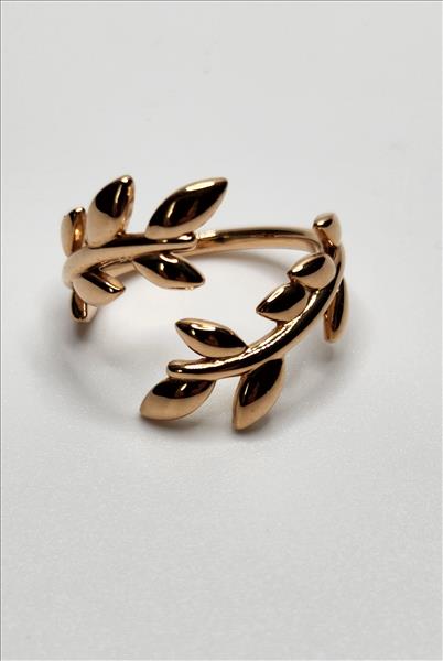 One lady’s signed Paloma Picasso for Tiffany and Company and stamped Au 750, 18kt pink gold Olive Leaf bypass ring (product number 67544501). The stem of this ring widens from 1.00mm wide at the top to 1.80mm round at the base. Attached to each bypass ends of this stem are a total of 15 various size plain leaf motif that extends in an upward direction. \nTotal Estimated Weight: 5.93 grams \nInstruments Used: microscope, gauges, metric scale, gold tester