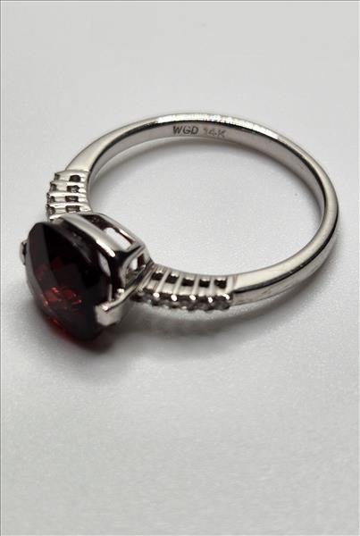 One lady’s stamped WGD and tested 14kt white gold Garnet and diamond ring. Contained at the centre is one, two tab claw set cushion shaped, checkerboard cut medium dark very slightly orangey red almandine Garnet that measures approximately 8.10x8.10x5.25mm and weighing approx. 2.60ct of LI1 clarity. This Garnet sits on a 4.30mm high double gallery. Extending from either side of the tab claw is a shank that widens from 1.50mm wide and 3.8mm high to 2.20mm wide and 1.25mm thick at the base. Shared claw double gallery set on each shoulder of this shank are the following round brilliant cut diamonds: 2x0.015ct and 3x0.02ct all of average I1 clarity, H-I colour and Good cut.\nTotal Estimated Weight: 3.07 grams \nTotal Estimated Garnet Weight: 2.60ct\nTotal Estimated Diamond Weight: 0.18ct\nInstruments Used: microscope, gauges, metric scale, gold tester