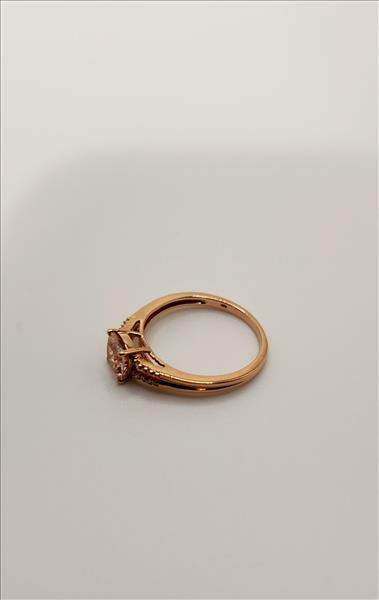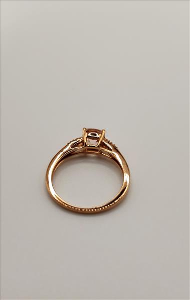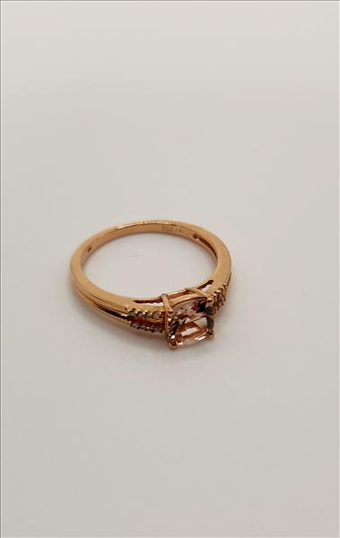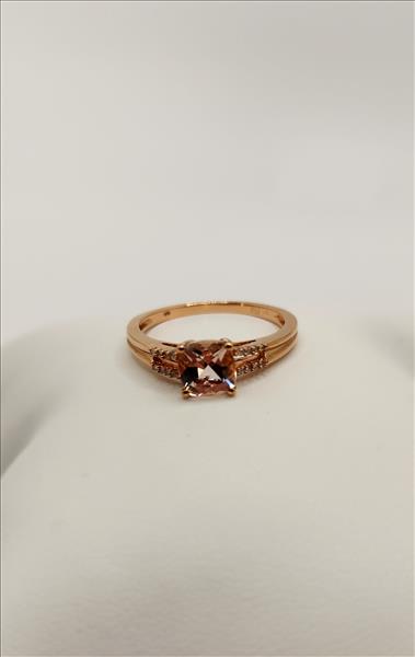 One lady’s stamped FDJ and tested 10kt pink gold Morganite and diamond ring. Contained at the centre is one double gallery four claw set cushion cut medium light very slightly light brownish orangey pink Morganite measuring approximately 6.10x6.05x3.89mm and weighing approx. 0.70ct of LI1 clarity. This stone sits between a split shank that tapers from 3.20mm wide to 1.50mm wide at the base. Shared claw set on each of the 1.20mm wide sides of the shank are 4x0.009ct single cut diamonds all of average I1 clarity, top light brown colour and Good cut.\nTotal Estimated Weight: 2.09 grams \nTotal Estimated Diamond Weight: 0.145ct\nTotal Estimated Morganite Weight: 0.70ct\nInstruments Used: microscope, gauges, metric scale, gold tester