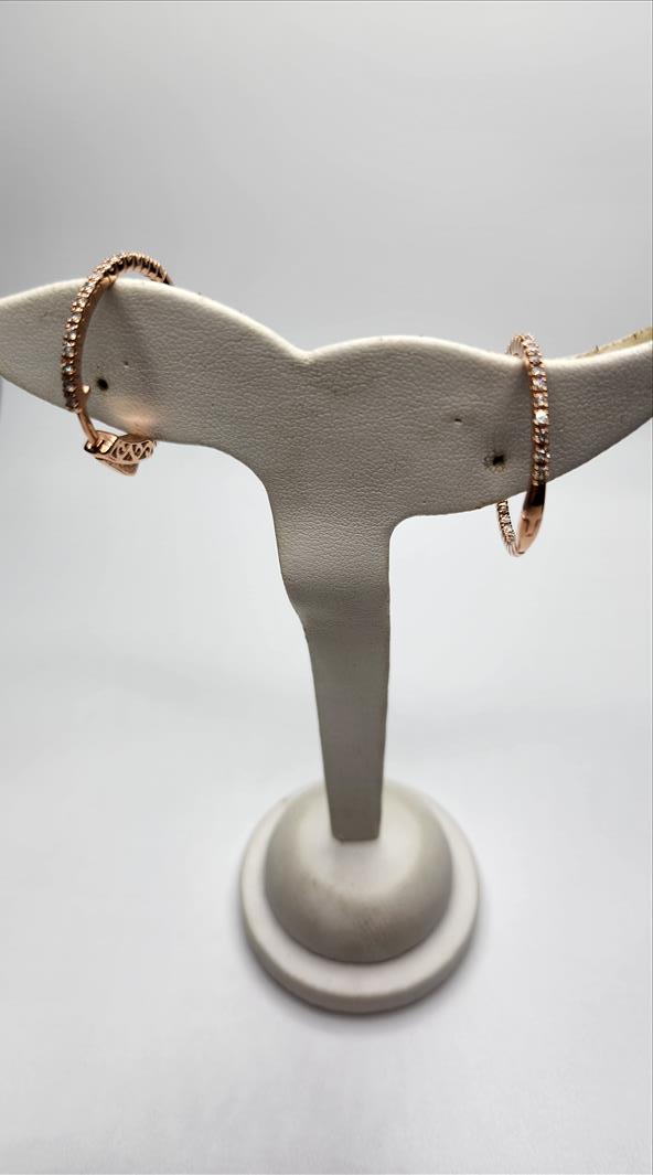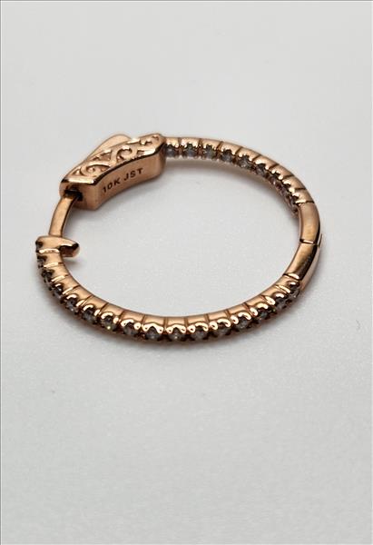 One pair of lady’s stamped and tested 10kt pink diamond inside and outside hoop earrings. These round shaped earrings measure 25.00mm across the profile. Four claw whale tail set down the front of these 1.70mm wide by 2.20mm deep settings are 16x0.015ct round brilliant cut diamonds. Four claw whale tail set down the inside of these 1.70mm wide by 2.10mm deep settings are 9x0.015ct round brilliant cut diamonds. All diamonds are of average I1 clarity, H-I colour and Good cut. These earrings open with a hinge at the base and fasten with a levered click-in post.\nTotal Estimated Weight: 5.26 grams \nTotal Estimated Diamond Weight: 0.75ct\nInstruments Used: microscope, gauges, metric scale, gold tester