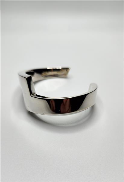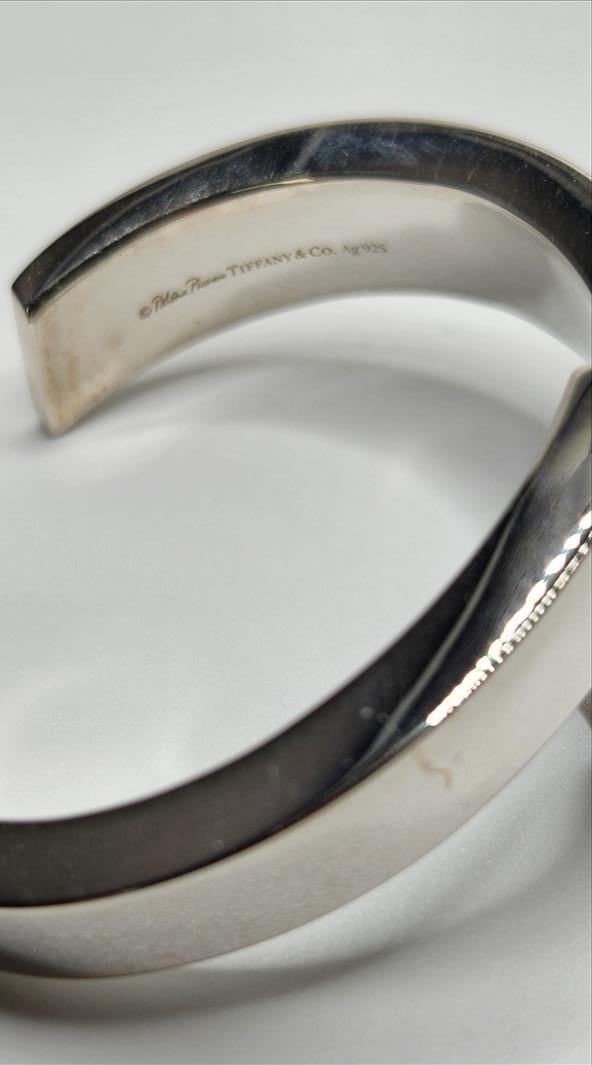 One lady’s signed Paloma Picasso for Tiffany’s and Company stamped 925 (sterling silver) “Lighting Bolt” cuff bracelet, Graffiti collection (product number 62499281). This bracelet measures 22.00mm wide and 5.65mm deep at the centre and tapers to 10.65mm wide and 2.70mm deep at one end and tapers to 7.25mm wide and 3.00mm deep at the other end. \nInstruments Used: microscope, gauges, metric scale, gold tester