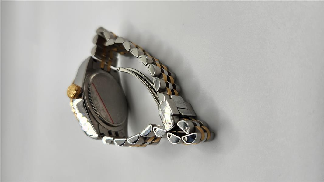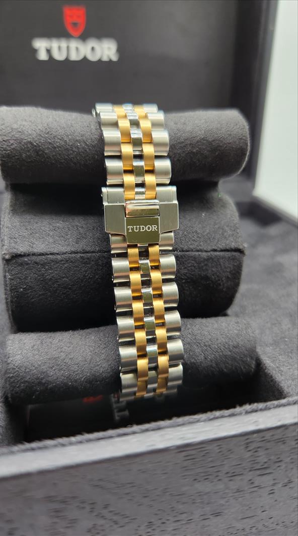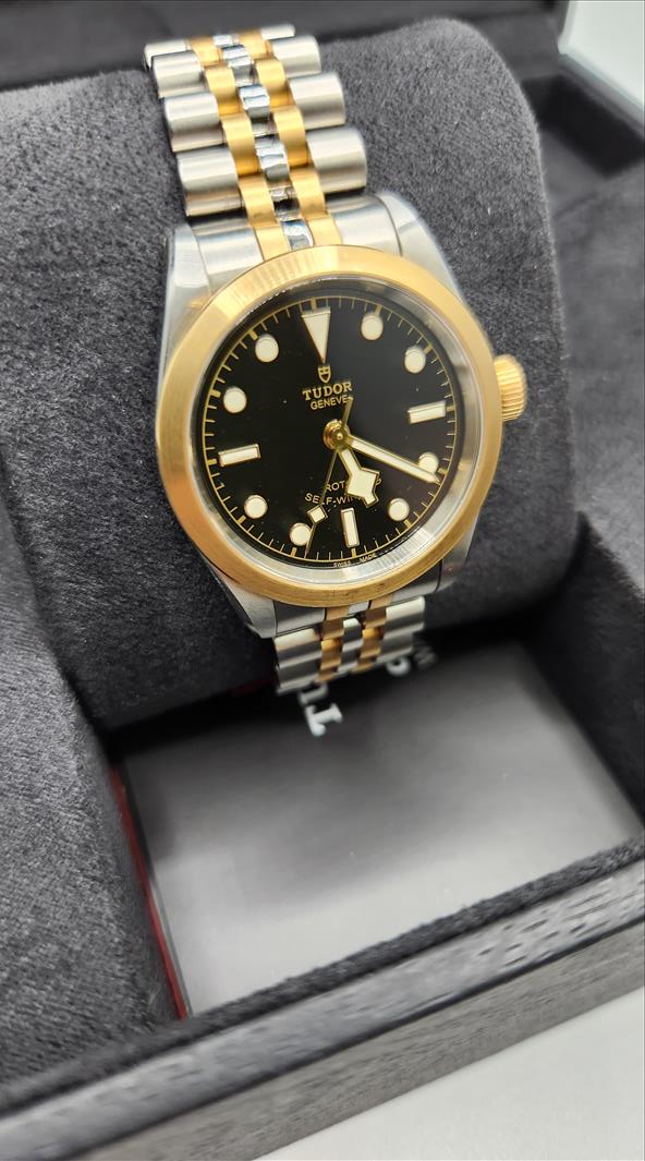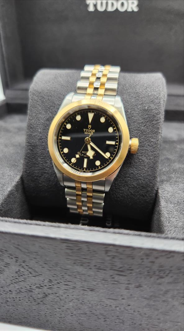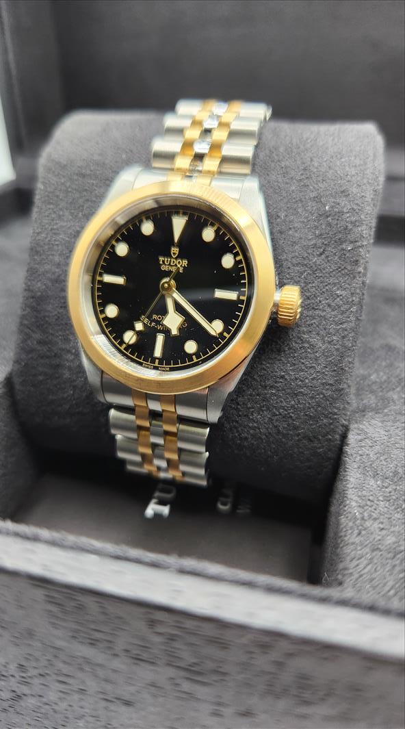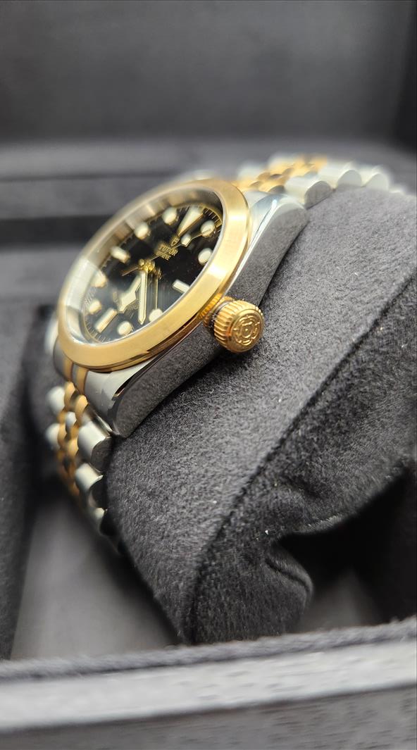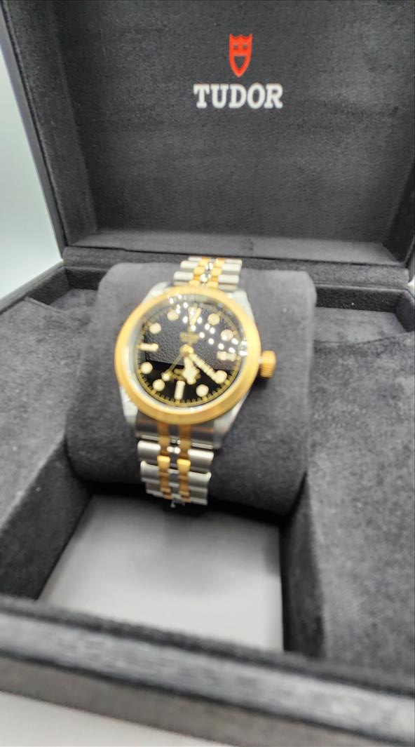 One lady’s Swiss made Tudor Black Bay yellow gold tone and stainless steel (32.0mm) wristwatch (Model number 79583-0001) c.a. 2022. Contained within this 31.0mm round stainless steel case is an automatic movement, a screw down crown, and is water protected to 15ATM. The black dial of this watch consists of disc and bar shaped luminescent markers and index style hour, minute and second hands which are also luminescent. The plain yellow tone steel bezel has a brushed finish. The crystal consists of a scratch-proof sapphire crystal. Attached to the case is a two toned brushed and polished steel five link bracelet (centre 2 links are gold toned steel) and fastens with a single deployant clasp\nInstruments Used: microscope, gauges, metric scale, gold tester\nComparable values from Internet