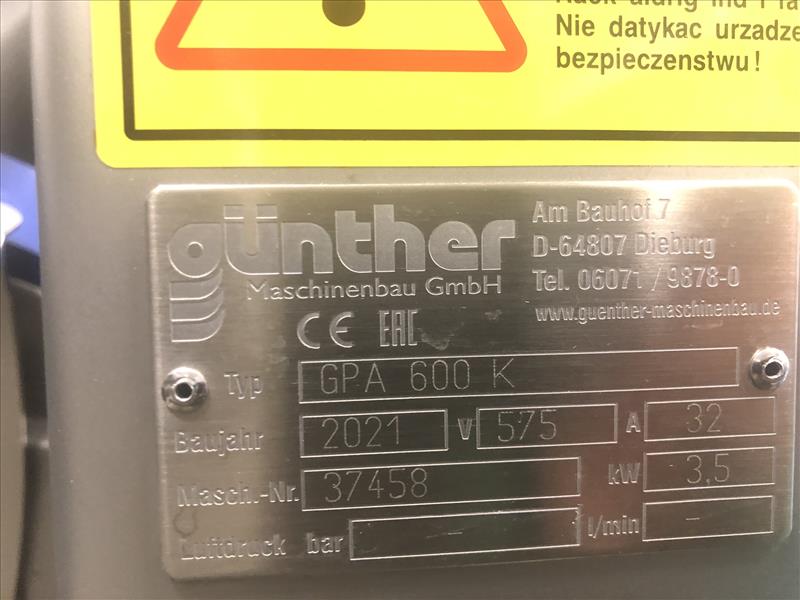 Gunther tumbler, 2021, mod. GPA 600 K, ser. no. 37458 (Subject to Confirmation) equipped with a 220/480/575 multi-tap transformer, new cost in 2021 was $80,000 USD