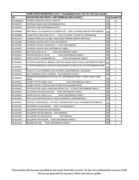 Consolidated Tech. Ind. case erector, mod. HC-120, ser. no. 8044 (2014), stainless steel, c/w Nordson ProBlue 7 hot melt and MarkemImaje 9028 continuous ink-jet coder, c/w spare parts (See inventory attached. This inventory list has been provided by the owner from their records. TCL has not confirmed the accuracy of this list & can not guarantee it's accuracy. Please use only as a guide.)