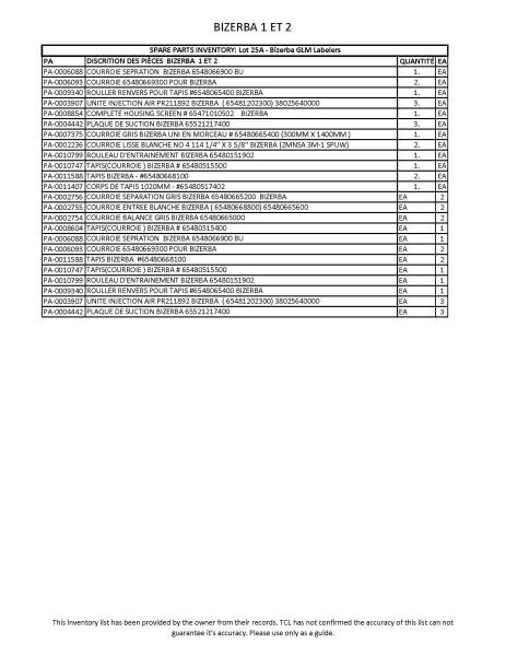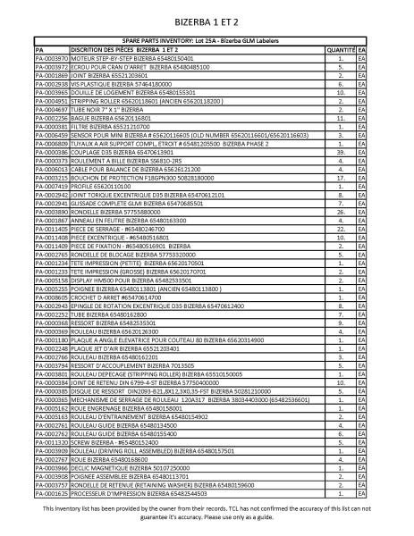 spare parts for Bizerba GLM labelers (See inventory attached. This inventory list has been provided by the owner from their records. TCL has not confirmed the accuracy of this list & can not guarantee it's accuracy. Please use only as a guide.)
