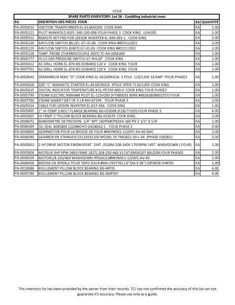 CookKing industrial oven, mod. CB-3445RH, ser. no. 040-081-001 (2014), conveyorized, stainless steel (currently stored in trailer), c/w spare parts (See inventory attached. This inventory list has been provided by the owner from their records. TCL has not confirmed the accuracy of this list & can not guarantee it's accuracy. Please use only as a guide.)