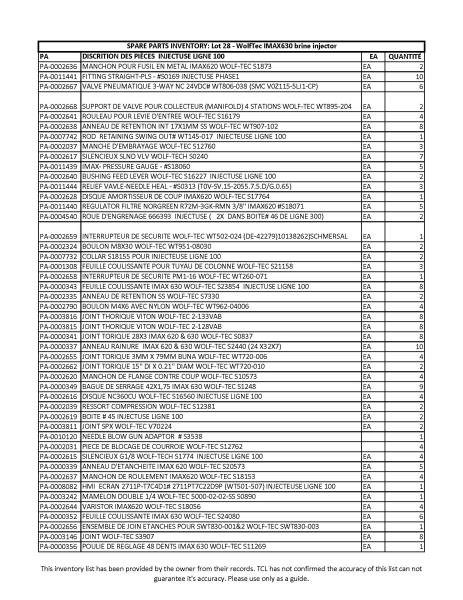 WolfTec brine injector, mod. IMAX630, ser. no. 3550, touch-screen control, stainless steel, c/w spare parts (See inventory attached. This inventory list has been provided by the owner from their records. TCL has not confirmed the accuracy of this list & can not guarantee it's accuracy. Please use only as a guide.)