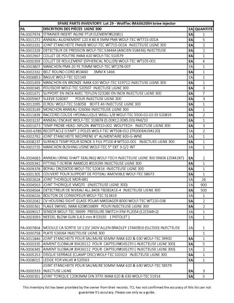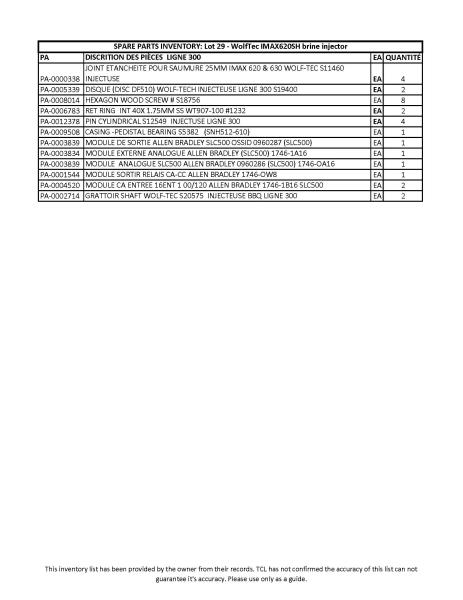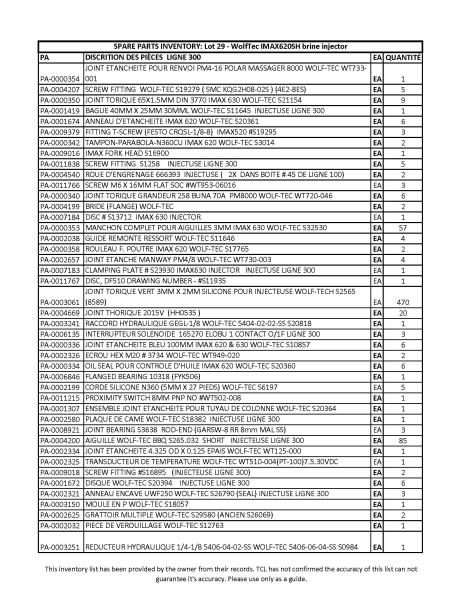 WolfTec brine injector, mod. IMAX620SH, ser. no. 3015, touch-screen control, stainless steel, c/w spare parts (See inventory attached. This inventory list has been provided by the owner from their records. TCL has not confirmed the accuracy of this list & can not guarantee it's accuracy. Please use only as a guide.)