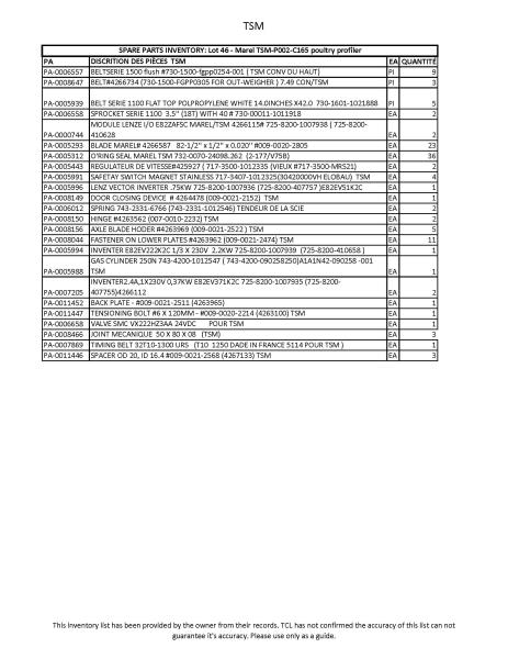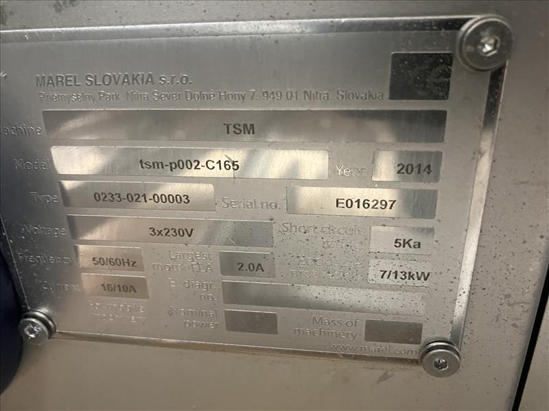 Marel poultry profiler, mod. TSM-P002-C165, ser. no. E016297 (2014), stainless steel, c/w (2) complete sets of molds, c/w spare parts (See inventory attached. This inventory list has been provided by the owner from their records. TCL has not confirmed the accuracy of this list & can not guarantee it's accuracy. Please use only as a guide.)
