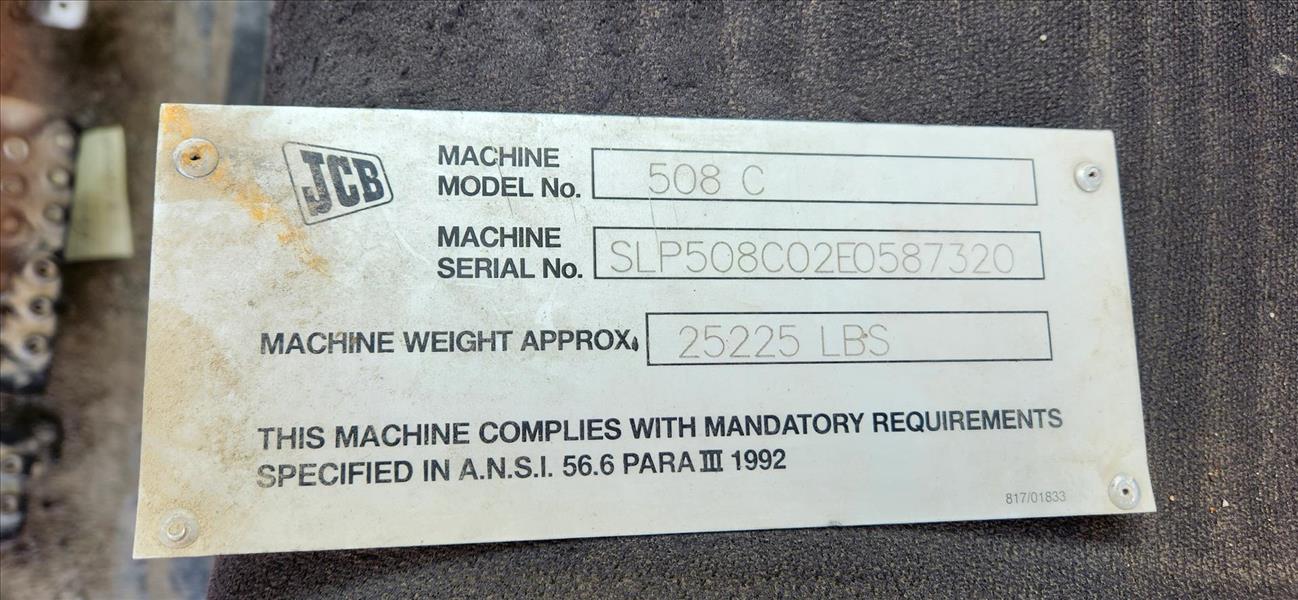 JCB telehandler, mod. 508C, ser. no. SLP508C02EO587320, rough terrain, variable reach, 8000 lbs. cap., approx. 7840 hrs. w/ forks [TAG 11]