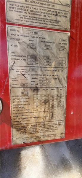 CleanBurn heater, mod. CB-5000 w/ CB-550-52 multi-oil burner, 500000 btu/hr c/w flammable liquids tank, 500 usg [TAG 43]