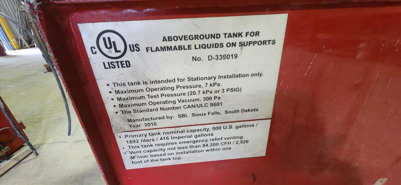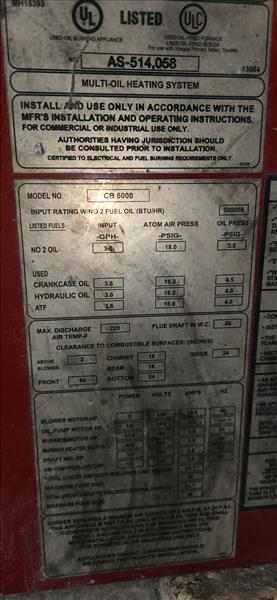CleanBurn heater, mod. CB-5000, 500000 btu/hr c/w flammable liquids tank, 500 usg [TAG 1452 / LOC 738498-0]